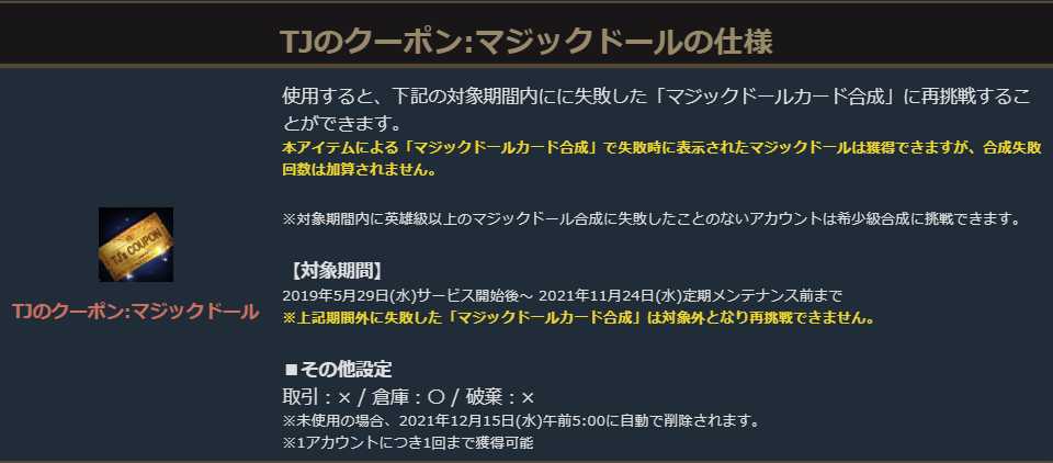 TJのクーポン:マジックドールは、対象期間内に合成失敗した最高等級のマジックドールカードの合成に再挑戦できる特別なアイテムです。