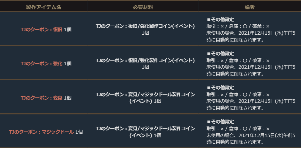 ・「TJのクーポン:強化」で強化に成功したアイテムは対象外となります。