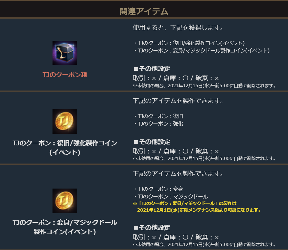・「TJのクーポン:復旧」を使用して復旧されたアイテムは、復旧前の状態に関係なく祝福付与と属性強化値が初期化されます。
