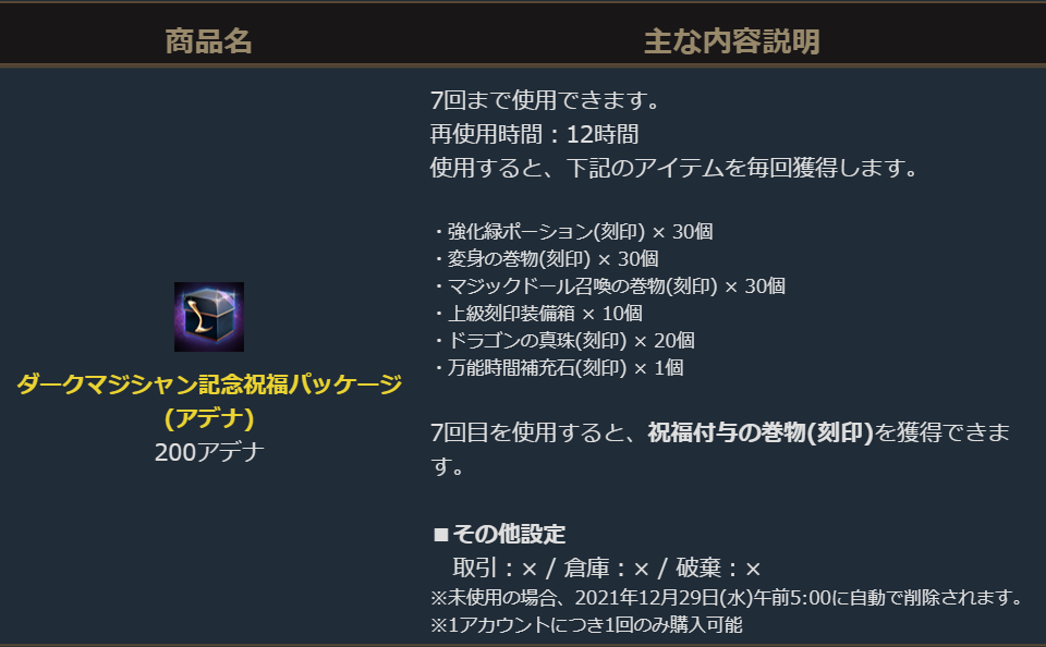 「ダークマジシャン記念パッケージ(アデナ)」は12時間おきに1回使用でき、冒険に役立つアイテムが毎回入手できます。
