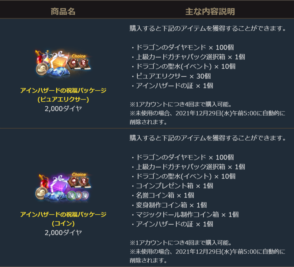 2021年12月8日より販売を開始しました「アインハザードの祝福パッケージ(ピュアエリクサー)」と「アインハザードの祝福パッケージ(コイン)」に関しまして、ご案内を申し上げます。