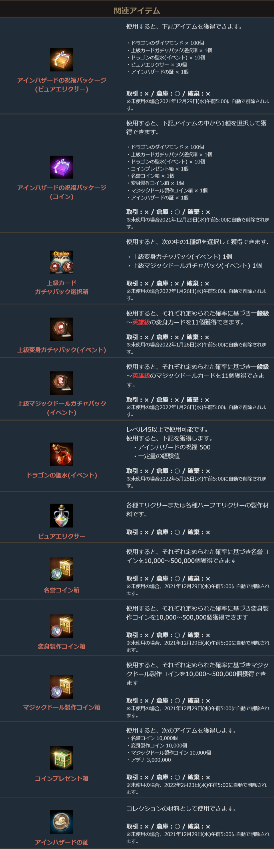 ※一部アイテムは未使用の場合、一定期間が経過すると自動で削除されます。詳しくは各アイテムの詳細をご確認ください。