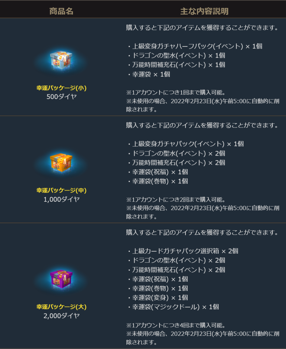 2022年1月26日より販売を開始しました「幸運パッケージ(小)」と「幸運パッケージ(中)」「幸運パッケージ(大)」に関しまして、ご案内を申し上げます。