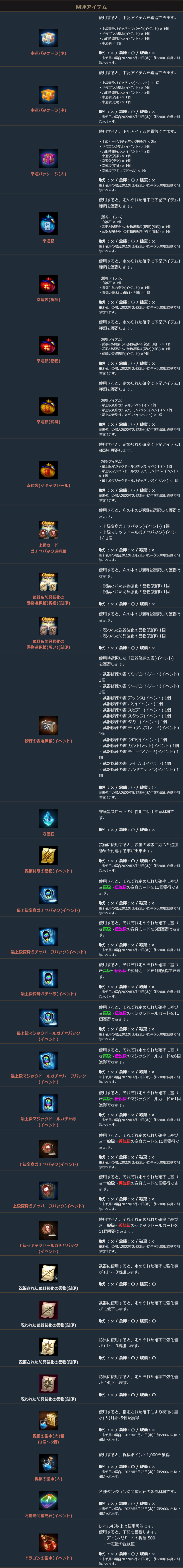 ドラゴンの聖水(イベント)と万能時間補充石(イベント)と一緒に最上級変身ガチャパック(イベント)や修練の書(イベント)守護石や祝福付与の巻物(イベント)などアイテムが定められた確率で獲得できる各種福袋がセットになったお得なパッケージです。