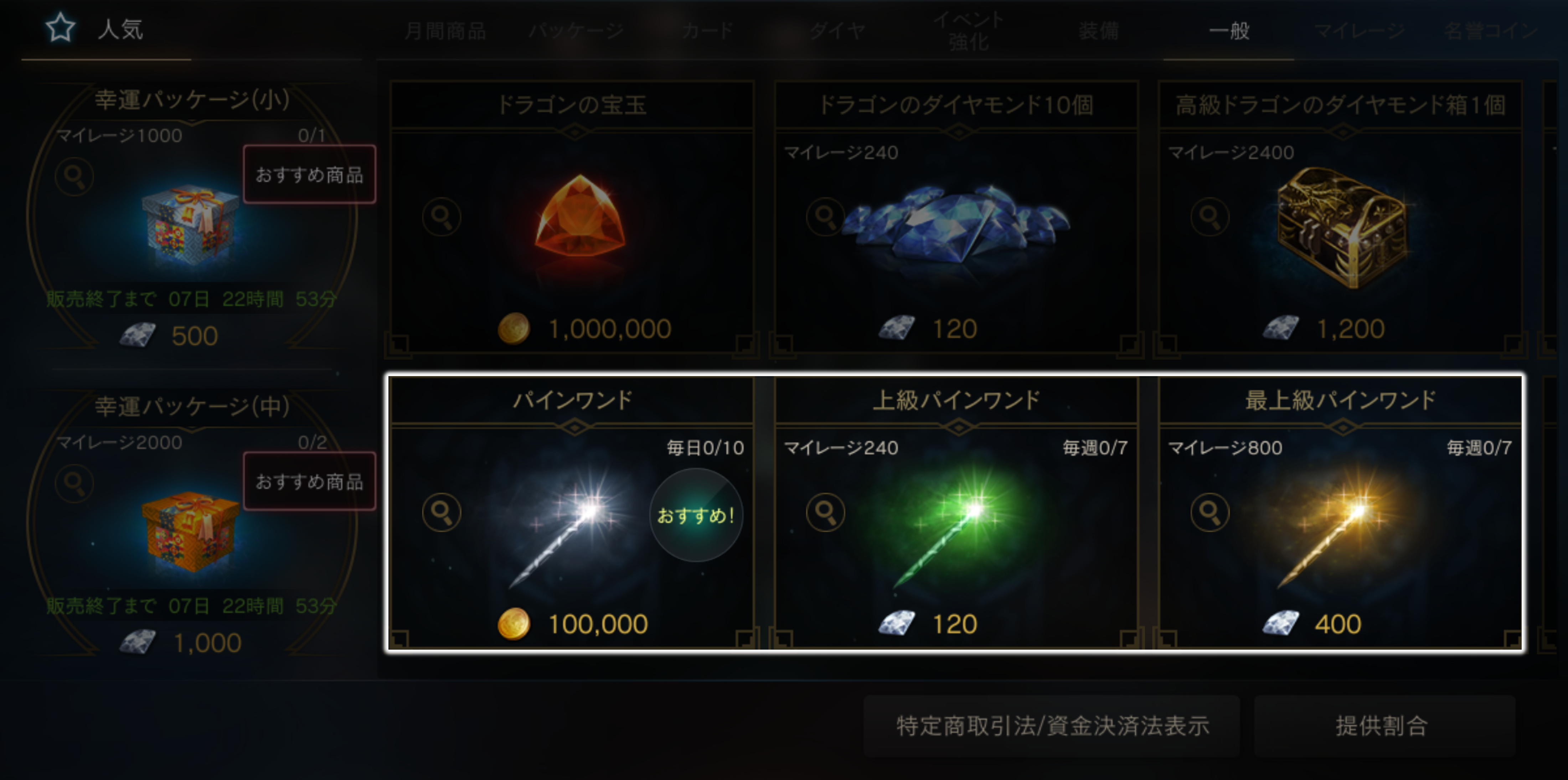 各種パインワンドはゲーム内「ショップ」>「一般」タブからアデナやダイヤで購入できます。