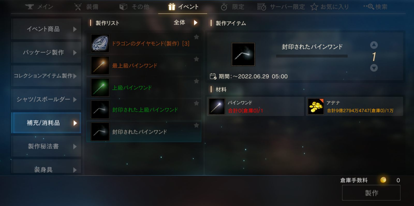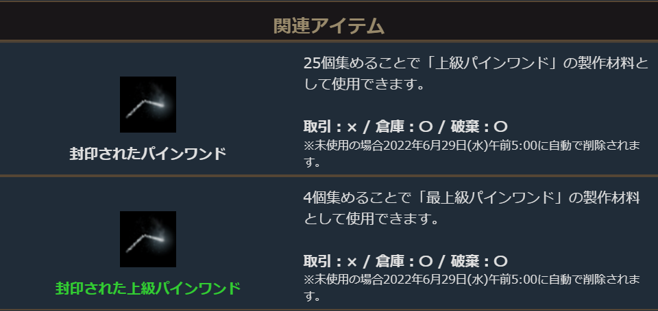 「封印された~」状態のパインワンドはそのままでは使用できないものの削除期限が6月29日に延び、期限内に複数集めることでより上位のパインワンドを製作することもできますので、すぐに使用しない場合などは製作を通して変換しておきましょう。