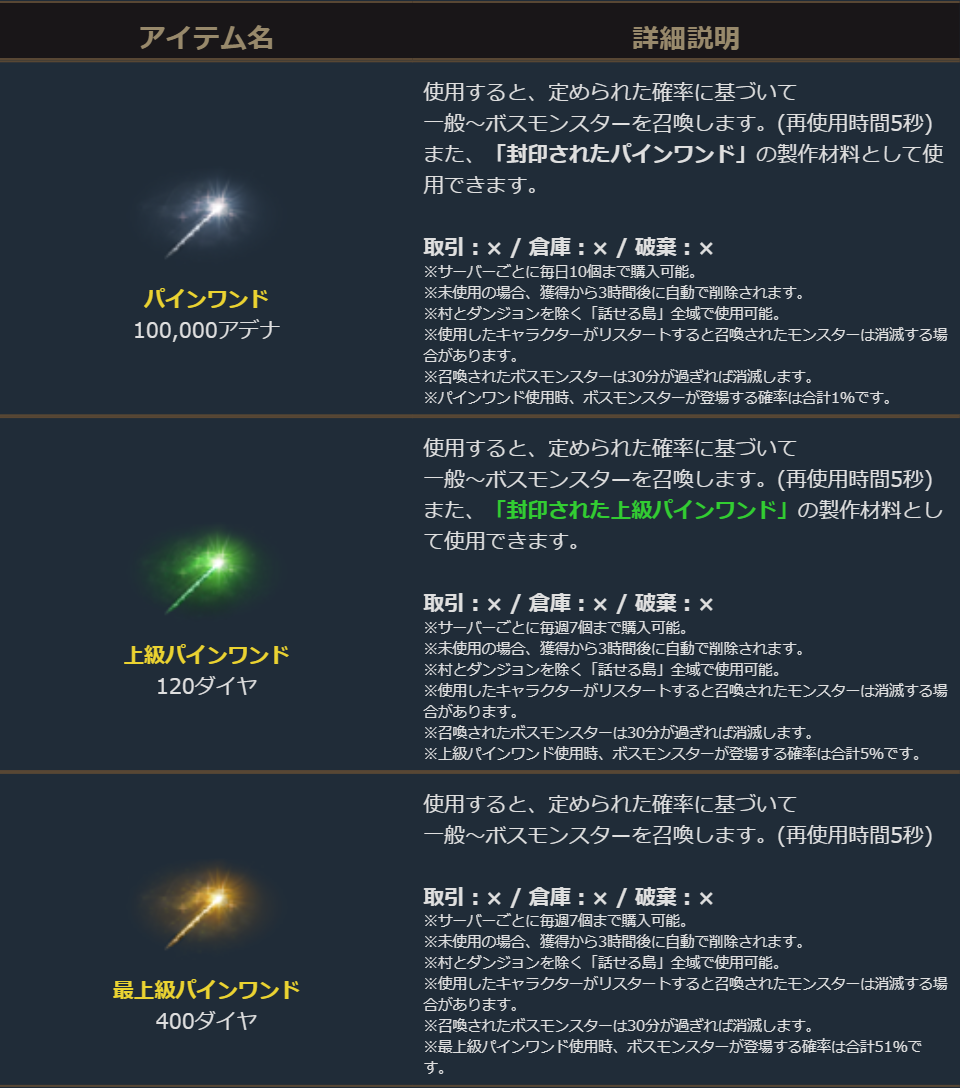 ※パインワンドの有効期限終了時に、召喚可能なモンスター及びドロップアイテムのリストや確率が変更されることがあります。