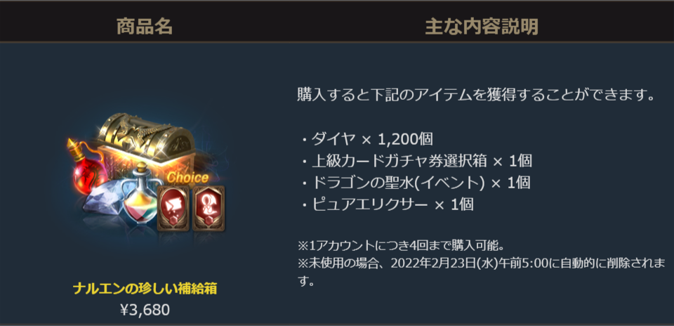 ダイヤと上級ガチャ券、ドラゴンの聖水にピュアエリクサーがセットになったお得なパッケージです。