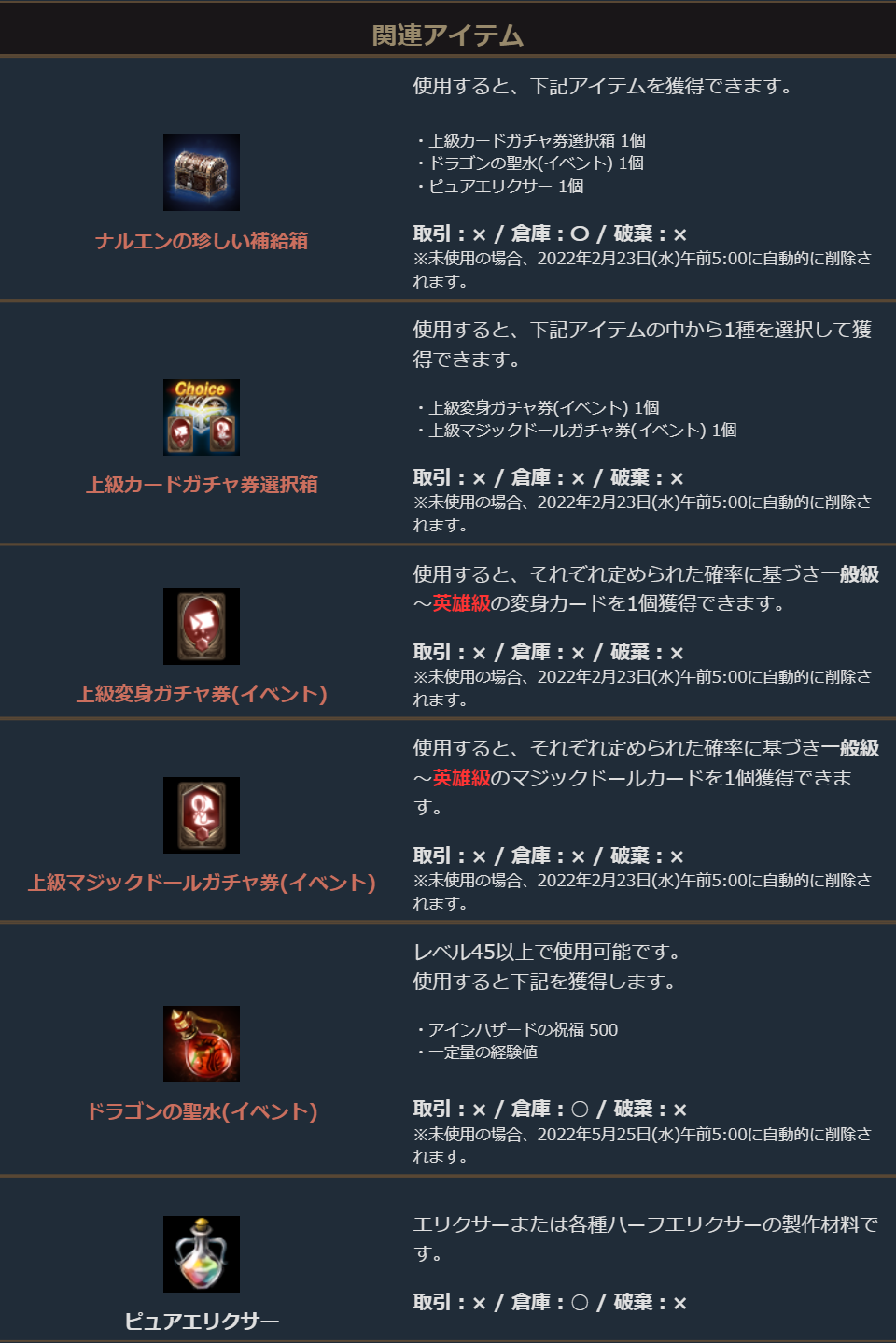 ※一部アイテムは未使用の場合、一定期間が経過すると自動で削除されます。詳しくは各アイテムの詳細をご確認ください。