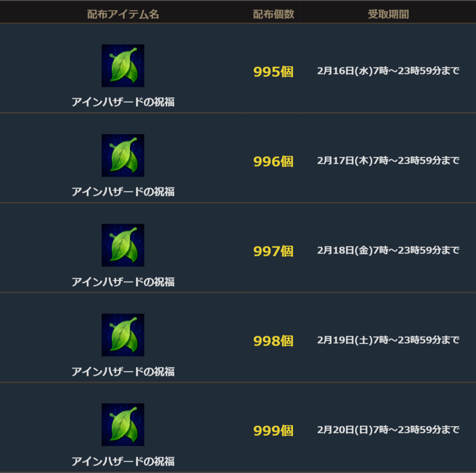 正式サービス開始から経過した日数分のアインハザードの祝福を前日の2月20日(日)まで毎日郵便で配布いたしますのでお役に立てて頂けますと幸いです。