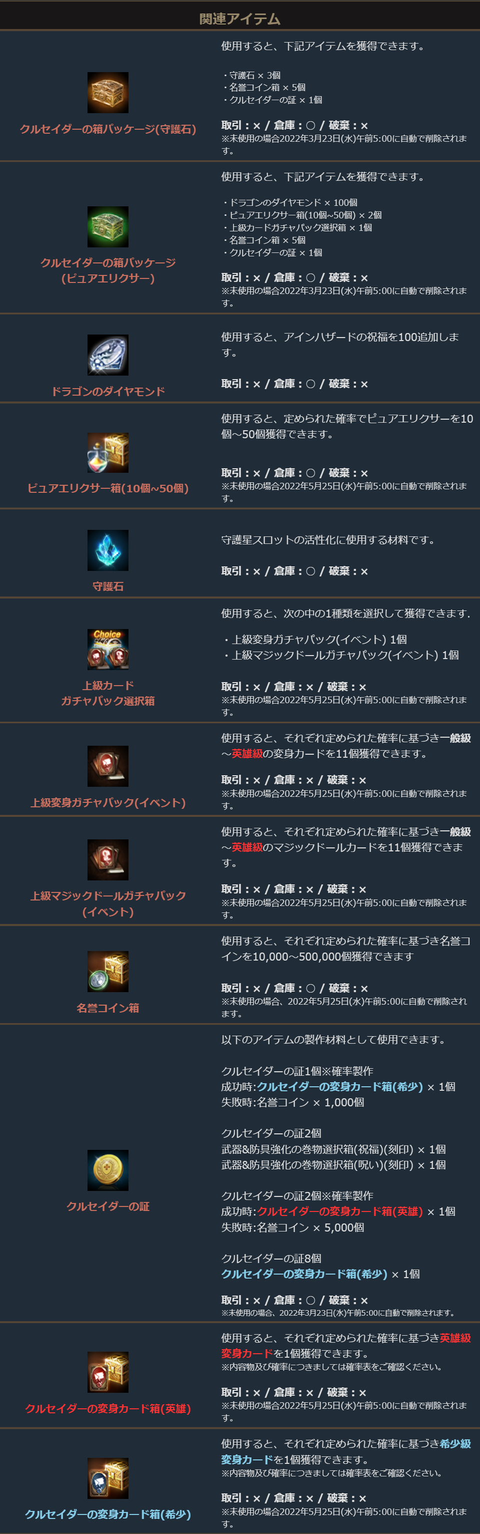 2022年2月23日より販売を開始しました「クルセイダーの箱パッケージ(守護石)」と「クルセイダーの箱パッケージ(ピュアエリクサー)」に関しまして、ご案内を申し上げます。