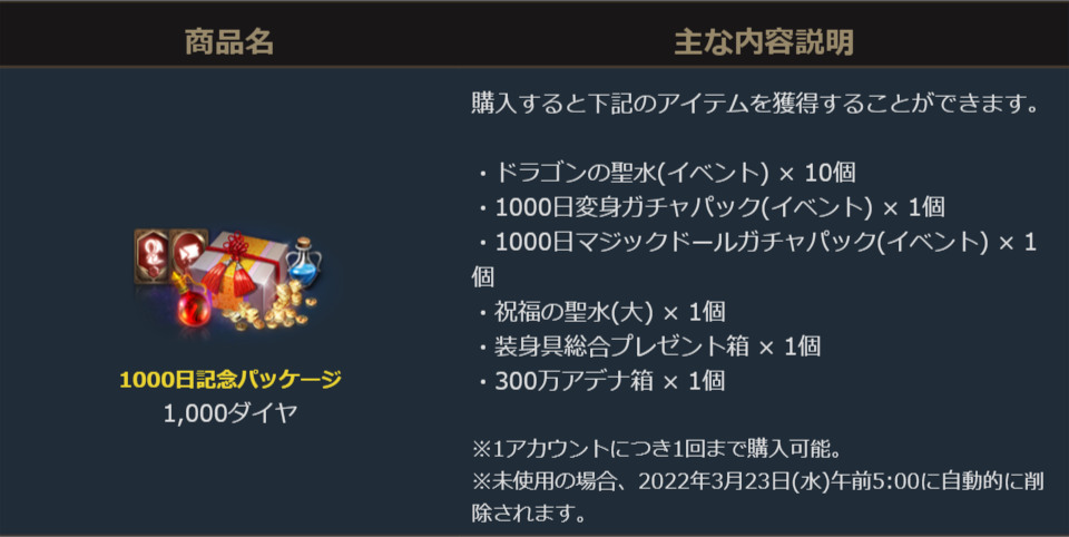 リリース1000日を記念した特別な「1000日変身ガチャパック(イベント)」と「1000日マジックドールガチャパック(イベント)」一緒に各種装身具を選べる「装身具総合プレゼント箱」等が入ったお得なパッケージです。