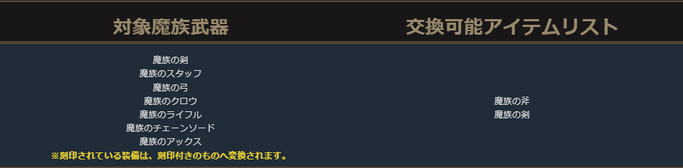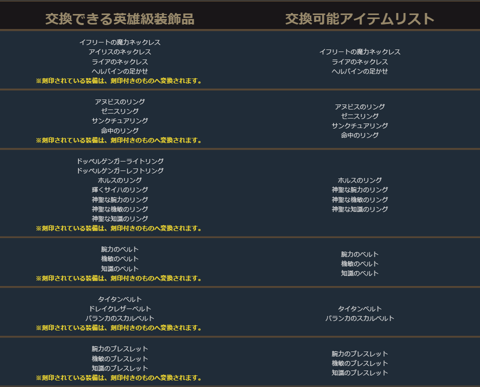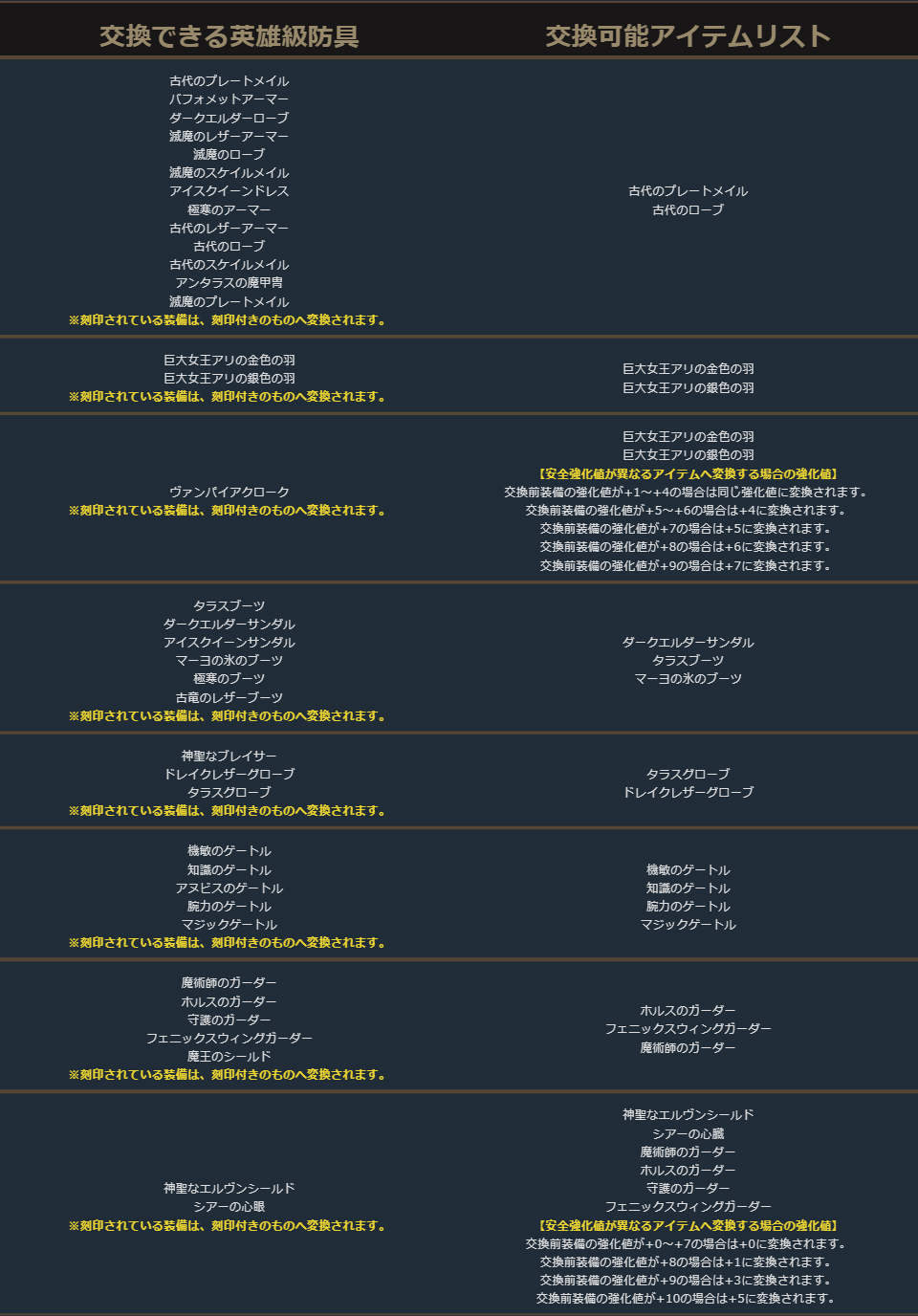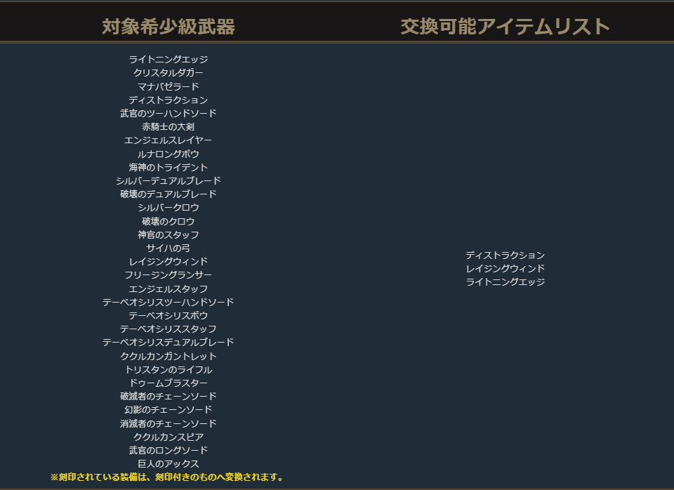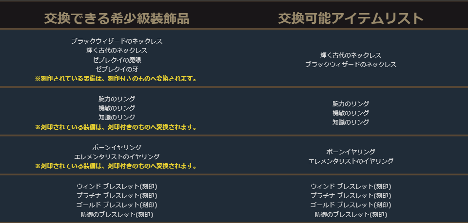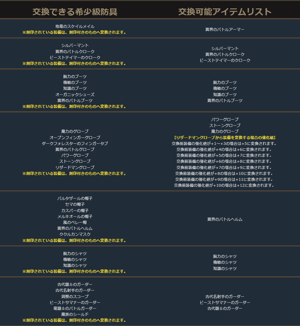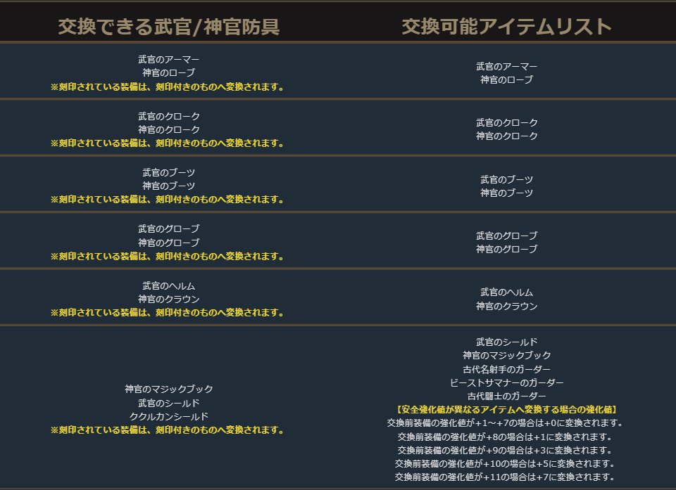 クラスチェンジを行う際に交換可能なアイテムは、下記の希少級以上のクラスチェンジ前のキャラクターが装備可能なアイテムが対象となります。