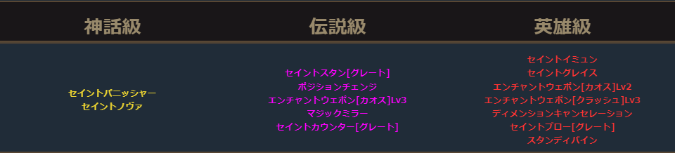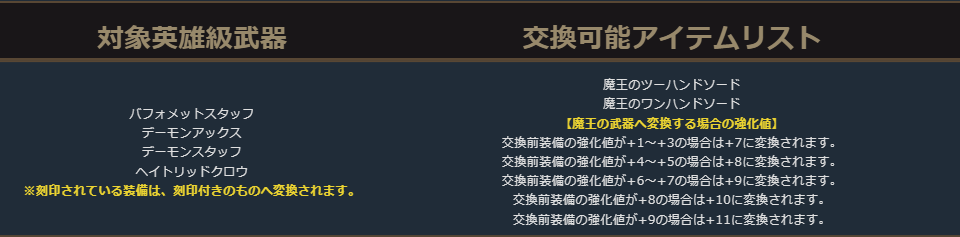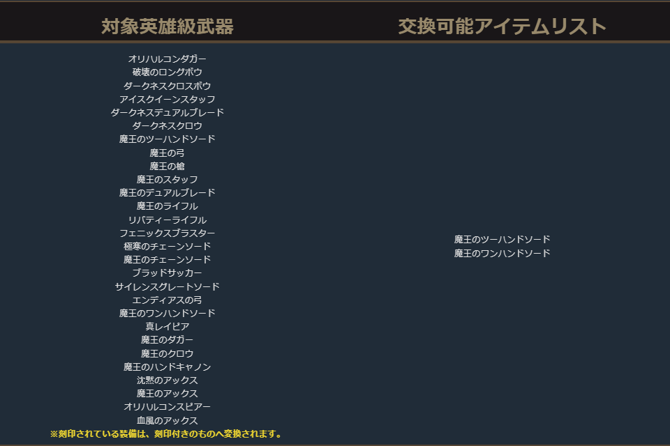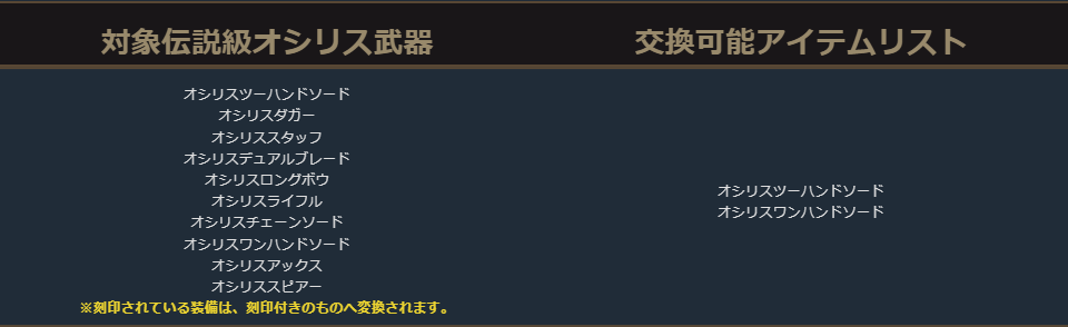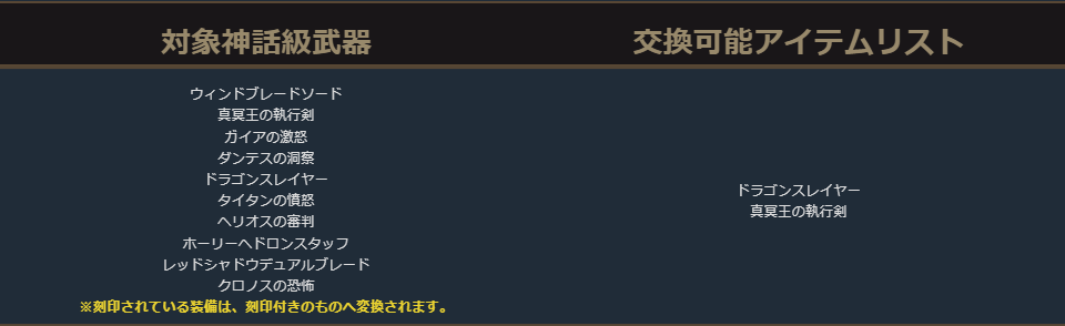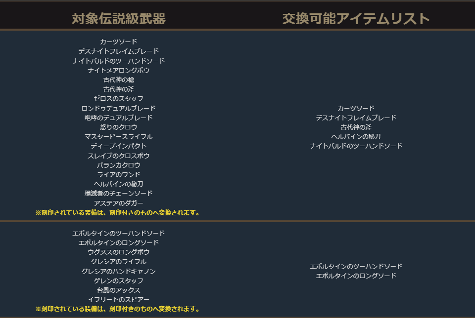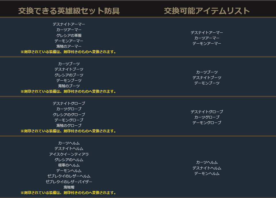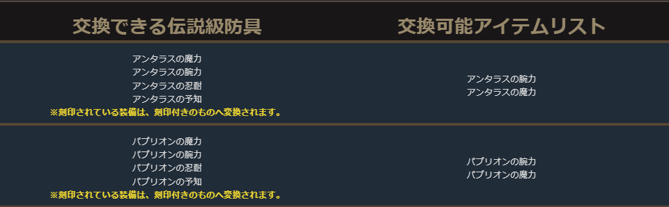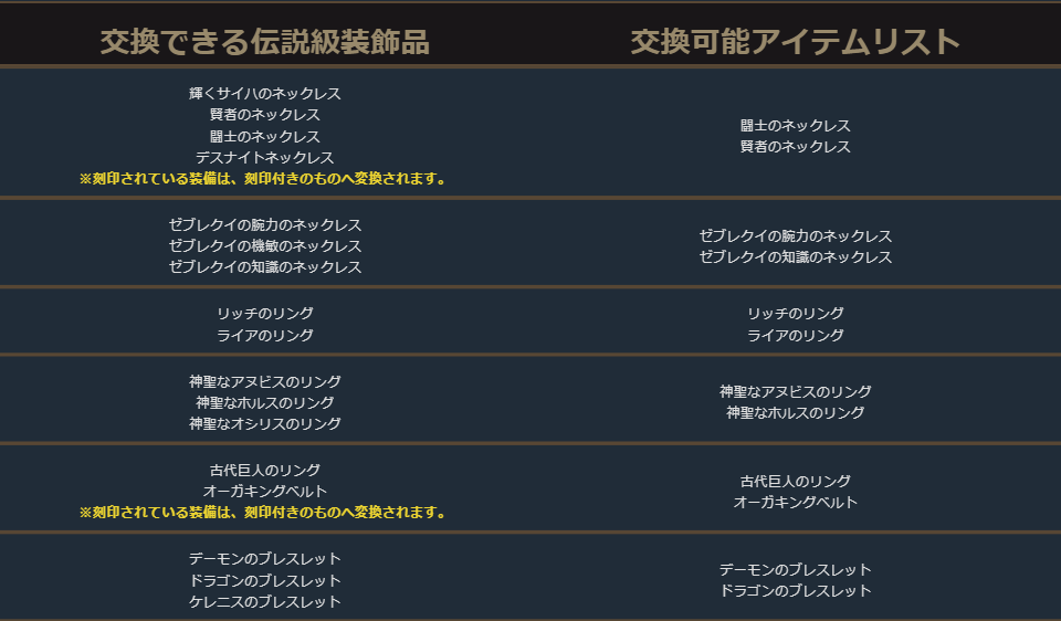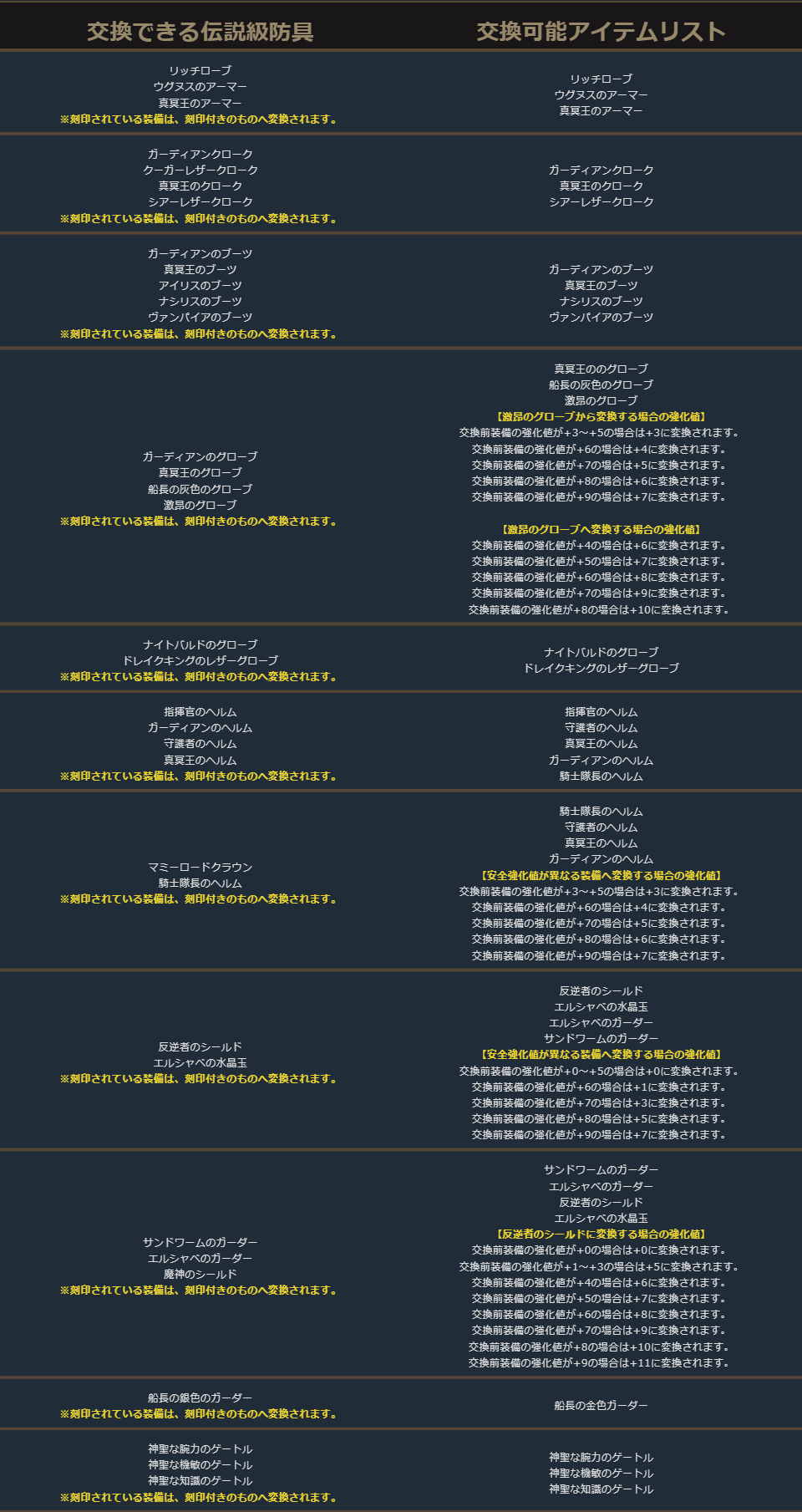 クラスチェンジを行う際に交換可能なアイテムは、下記の希少級以上のクラスチェンジ前のキャラクターが装備可能なアイテムが対象となります。
