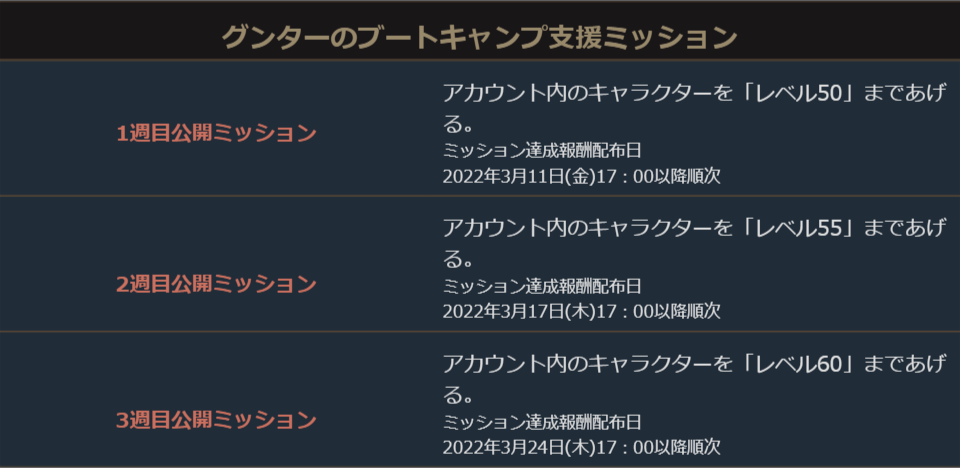 「3週目のミッション」の公開と「レベル60達成報酬」の紹介、動画で見るキャラクター育成の追加を致しました。