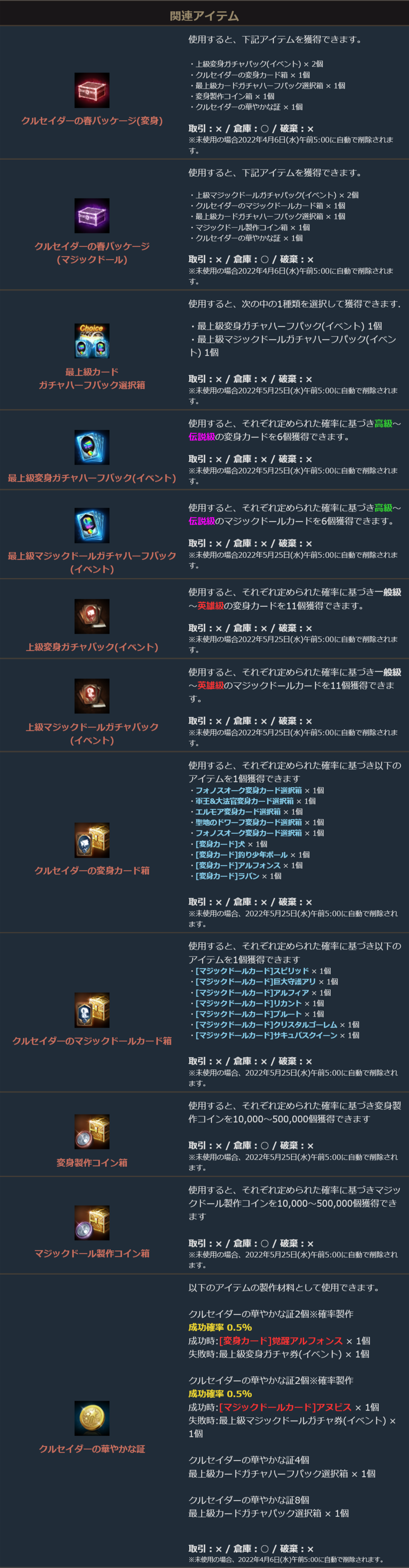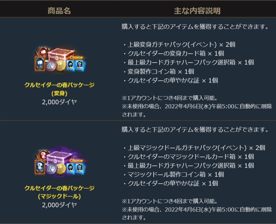 2022年3月10日より販売を開始しました「クルセイダーの春パッケージ(変身)」と「クルセイダーの春パッケージ(マジックドール)」に関しまして、ご案内を申し上げます。