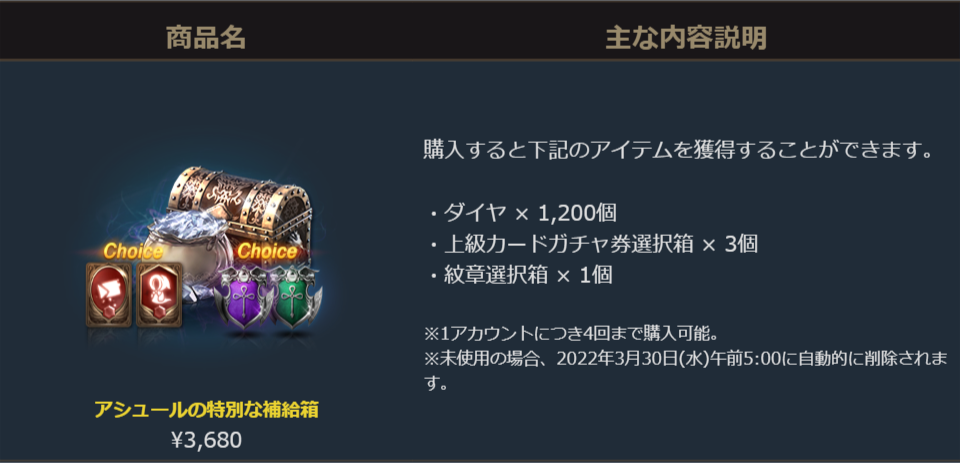 ダイヤと上級ガチャ券、紋章選択箱がセットになったお得なパッケージです。