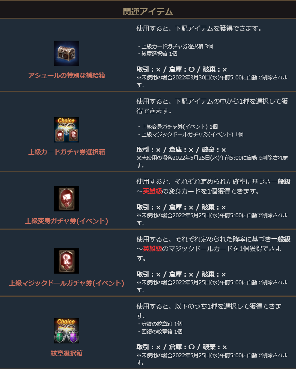 ※一部アイテムは未使用の場合、一定期間が経過すると自動で削除されます。詳しくは各アイテムの詳細をご確認ください。