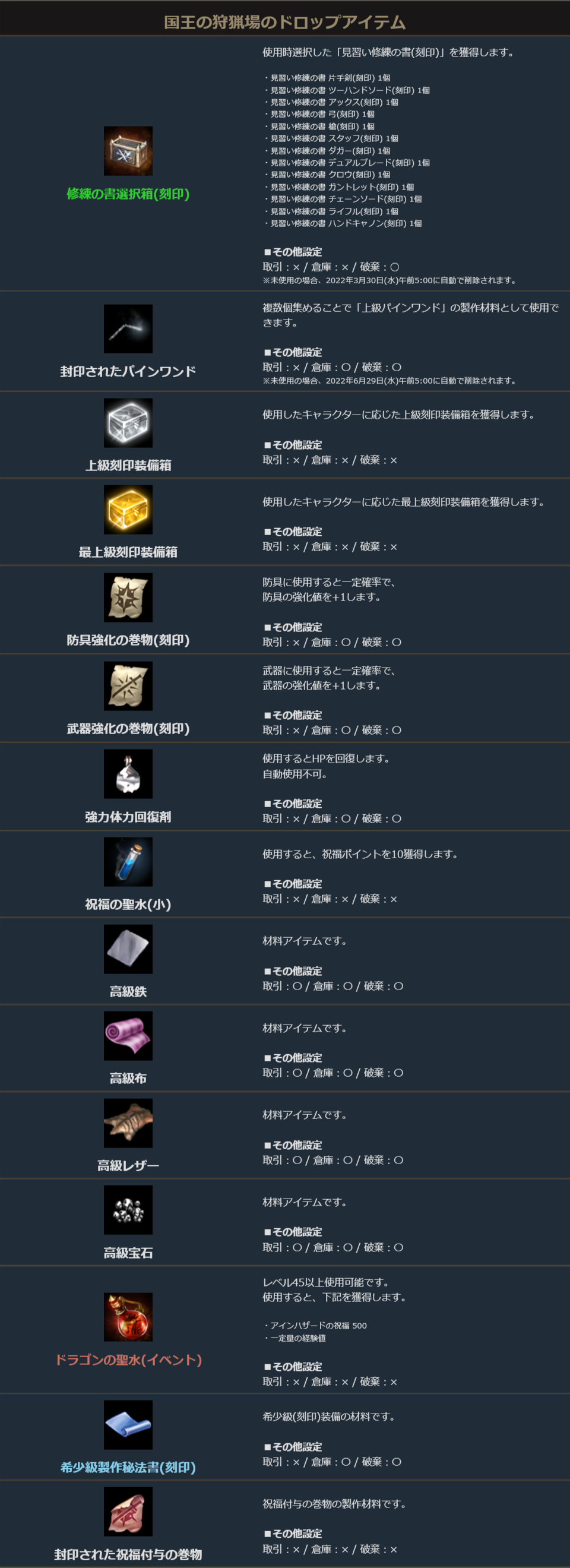 今回の国王の狩猟場では、前回同様ドラゴンの聖水や希少級製作秘法書の獲得が狙えるほか、武器の熟練度の経験値を獲得できる見習い修練の書を手に入れる事ができる修練の書選択箱(刻印)のドロップを狙うこともできます!