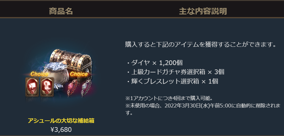 ダイヤと上級ガチャ券、ブレスレット1種を選んで獲得できる「輝くブレスレット選択箱」がセットになったお得なパッケージです。