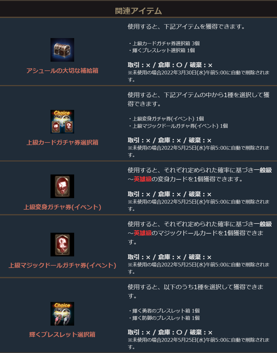 ※一部アイテムは未使用の場合、一定期間が経過すると自動で削除されます。詳しくは各アイテムの詳細をご確認ください。