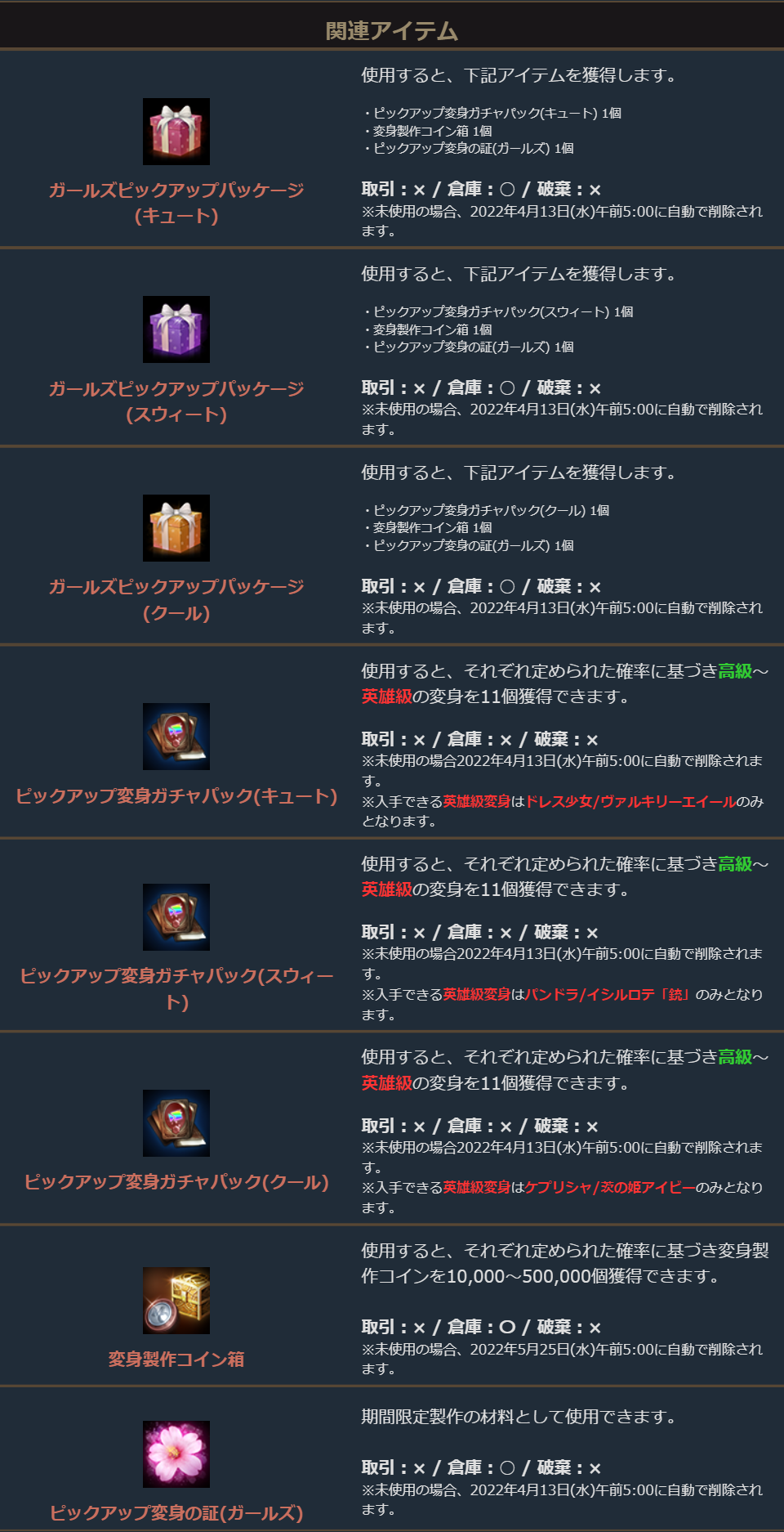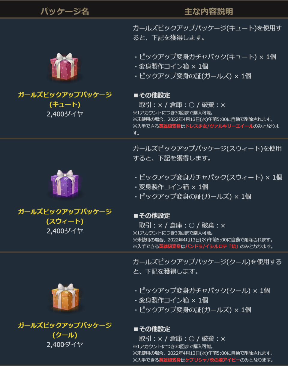2022年3月23日より、ゲーム内ショップで「ガールズピックアップパッケージ」の販売を開始しました。