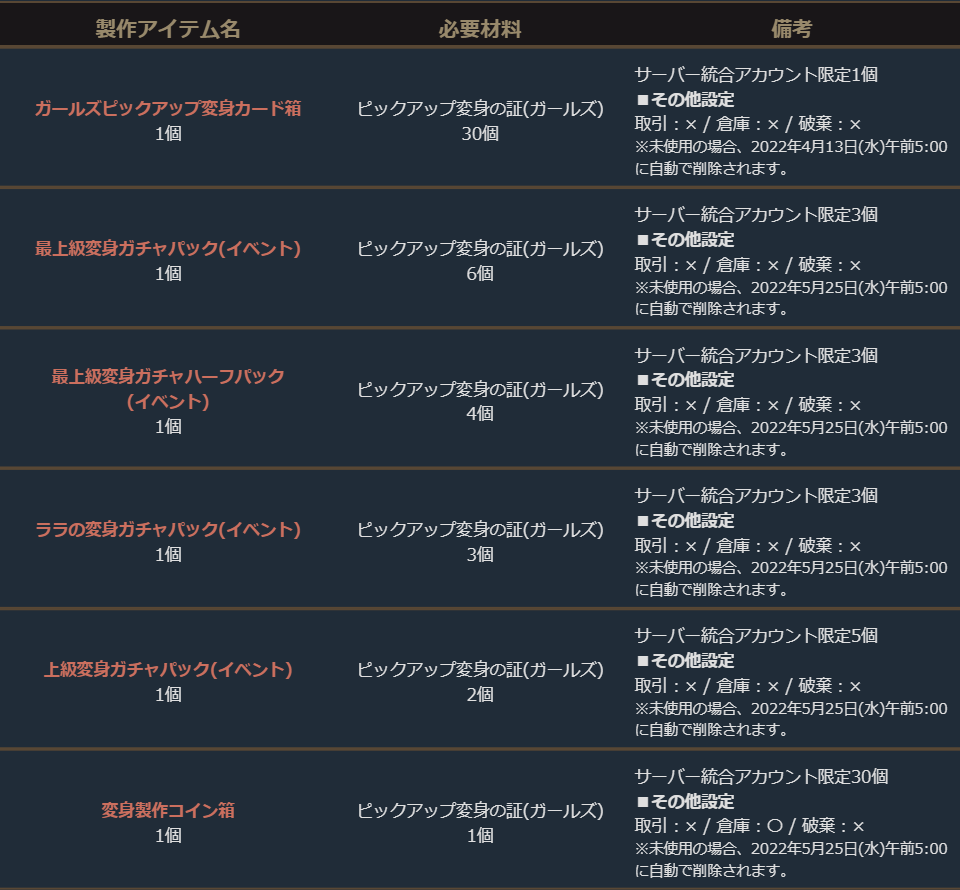 ※一部アイテムは未使用の場合、一定期間が経過すると自動で削除されます。詳しくは各アイテムの詳細をご確認ください。