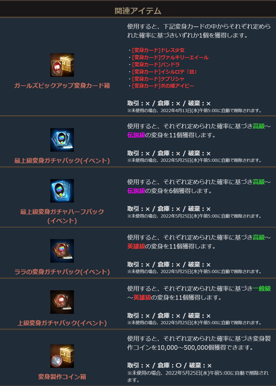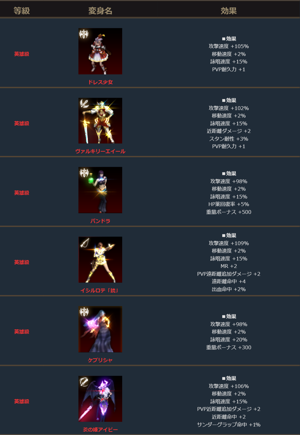 ピックアップ変身ガチャパックから入手できる英雄級変身の詳細を追記致しました。