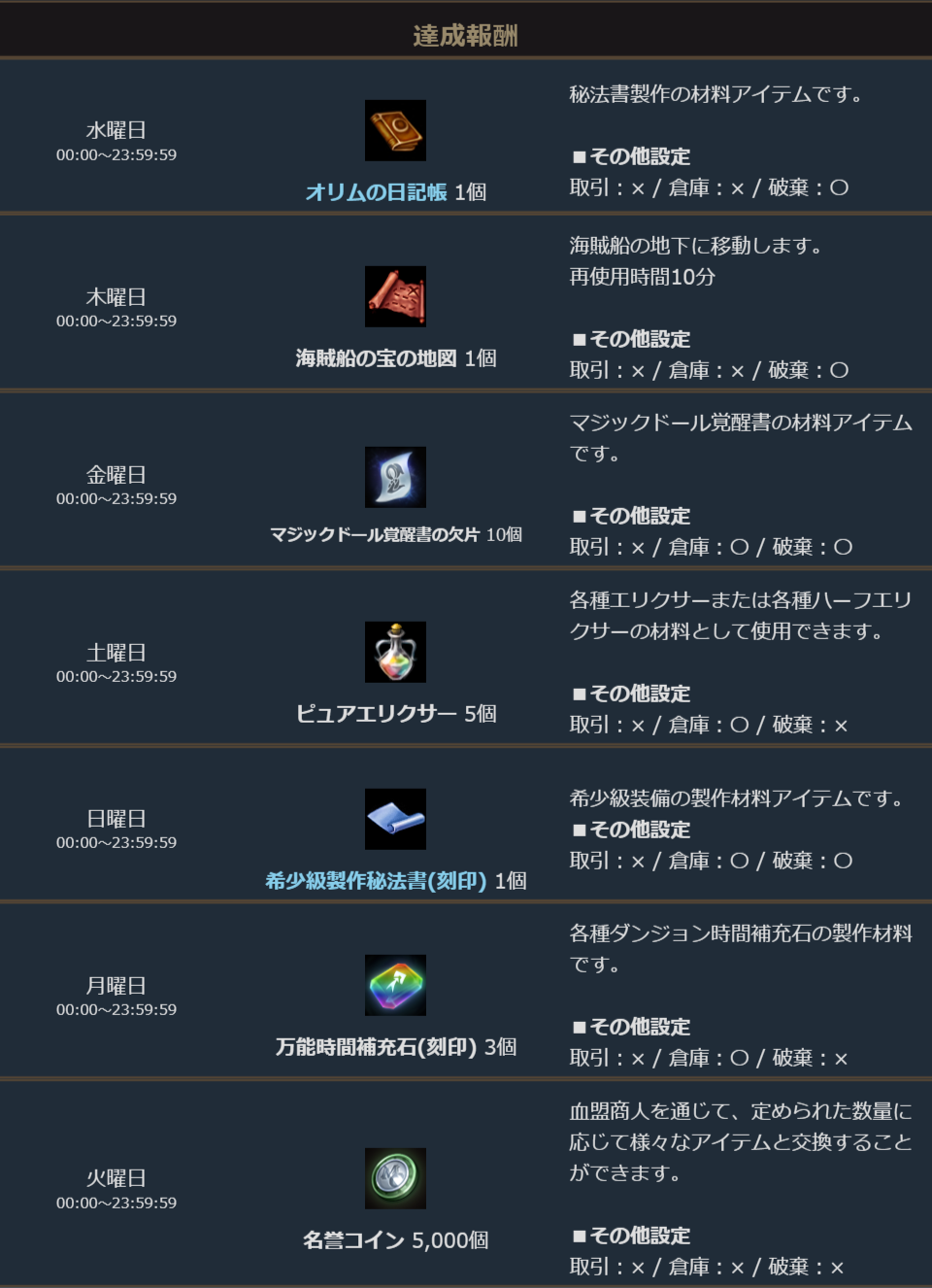 全ての曜日で達成すると、下記の報酬が全て獲得できます。