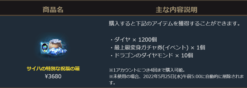 ダイヤに加えて「ドラゴンのダイヤモンド」や「最上級変身ガチャ券(イベント)」がセットになったお得な商品です。