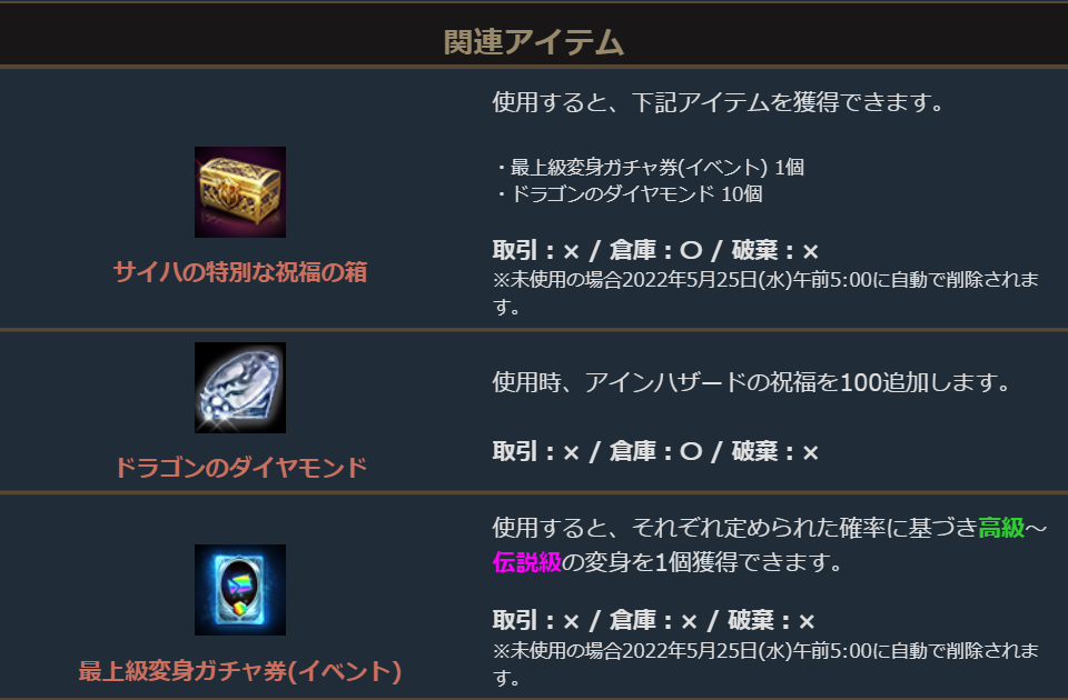 ※一部アイテムは未使用の場合、一定期間が経過すると自動で削除されます。詳しくは各アイテムの詳細をご確認ください。