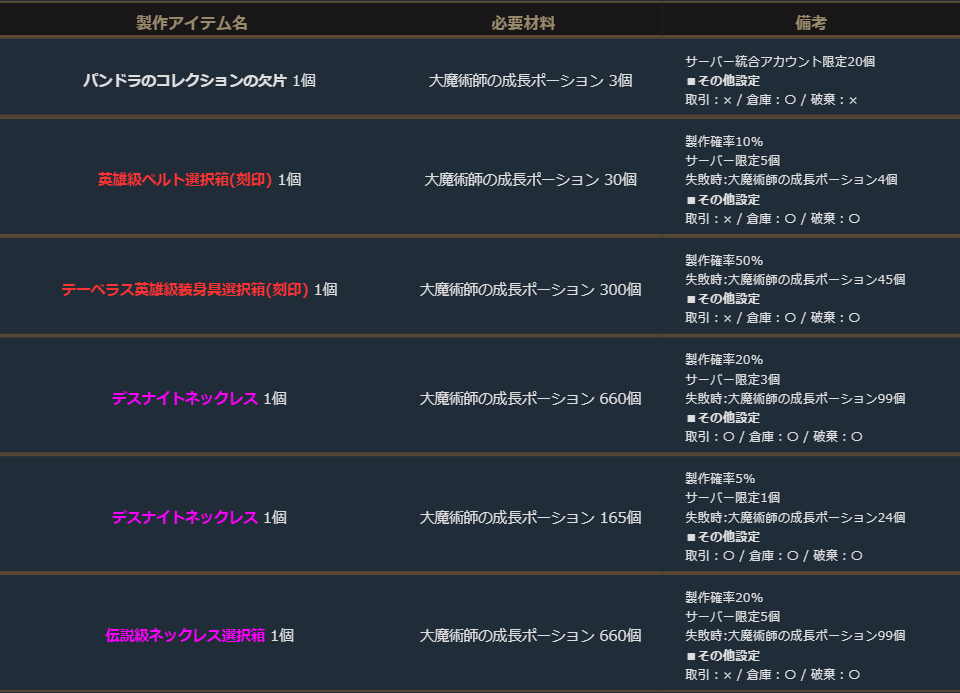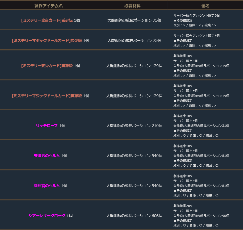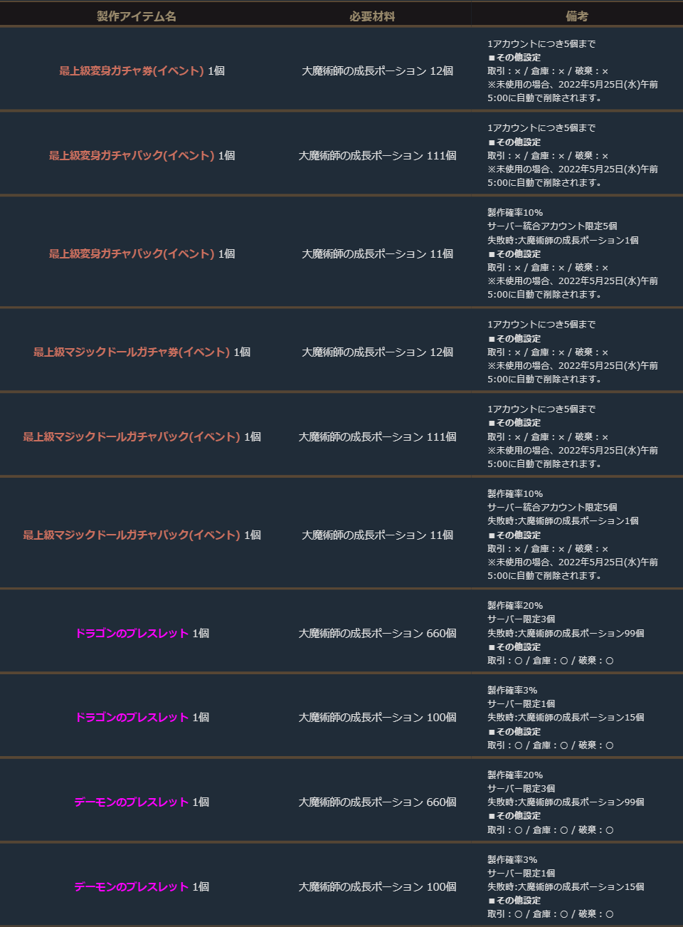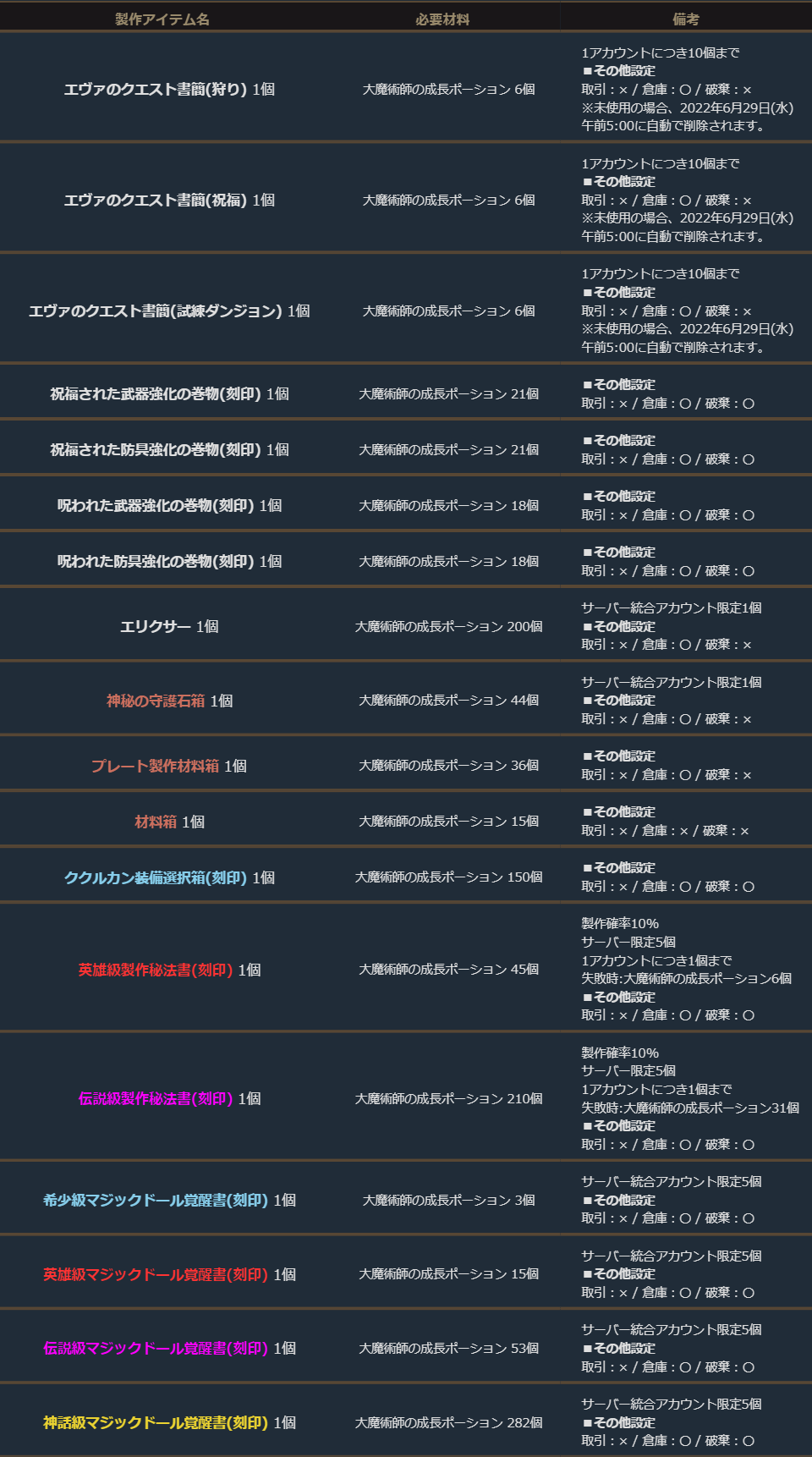 期間中、「大魔術師の成長ポーション」を使用して、下記の製作を行うことができます。