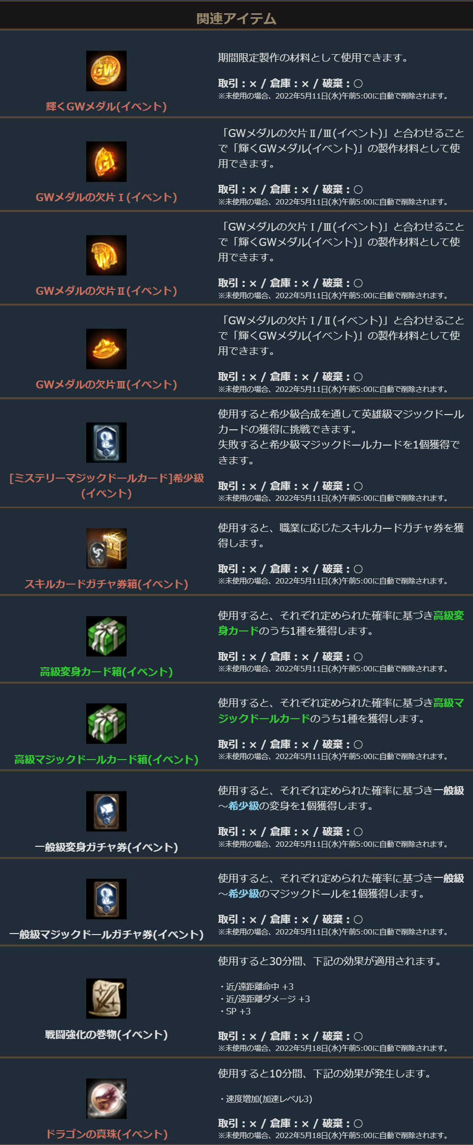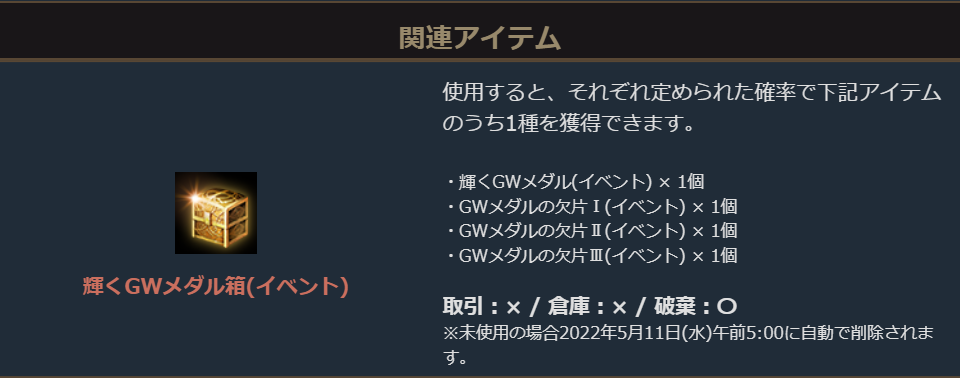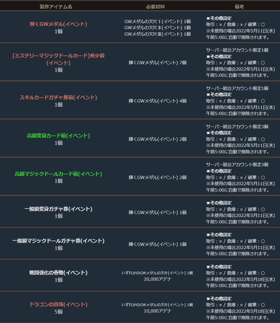 「輝くGWメダル箱(イベント)」から入手できる各種イベントアイテムを材料として、期間中様々なアイテムを製作することができます。