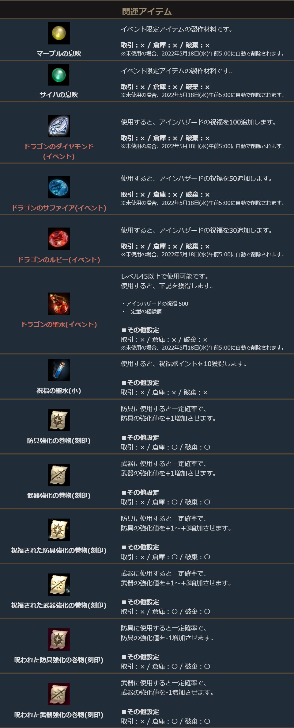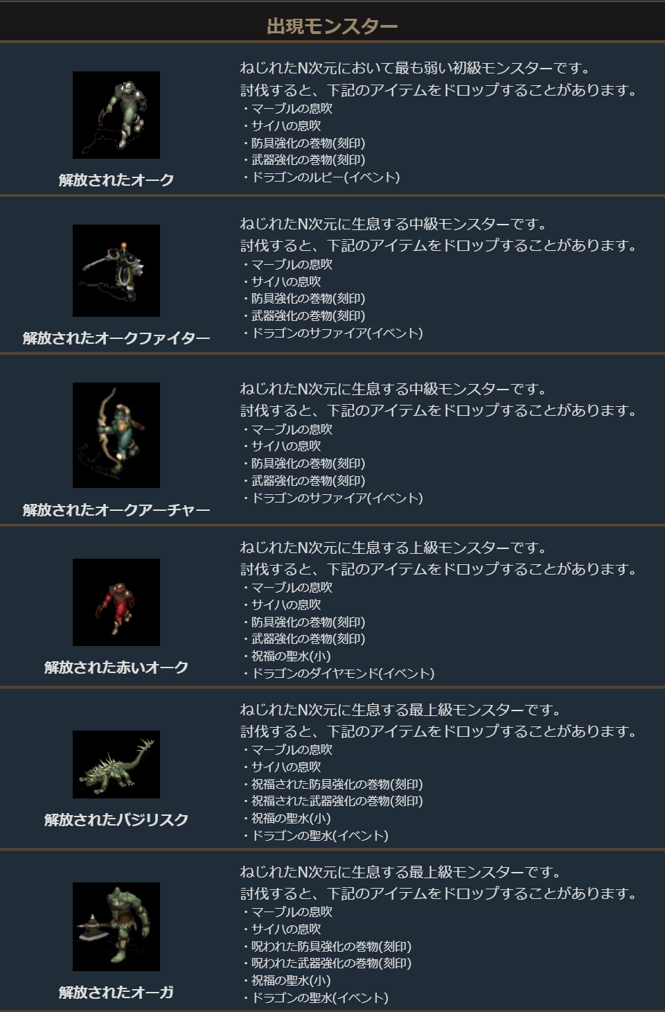 「ねじれたN次元」のモンスターからは前回に引き続き各種強化の巻物やドラゴンのダイヤモンド、「サイハの息吹」などが入手できるほか、今回から新規アイテム「マーブルの息吹」がドロップするようになります。