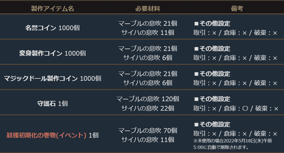 「マーブルの息吹」は「サイハの息吹」と合わせることで期間限定製作の材料として使用できます。