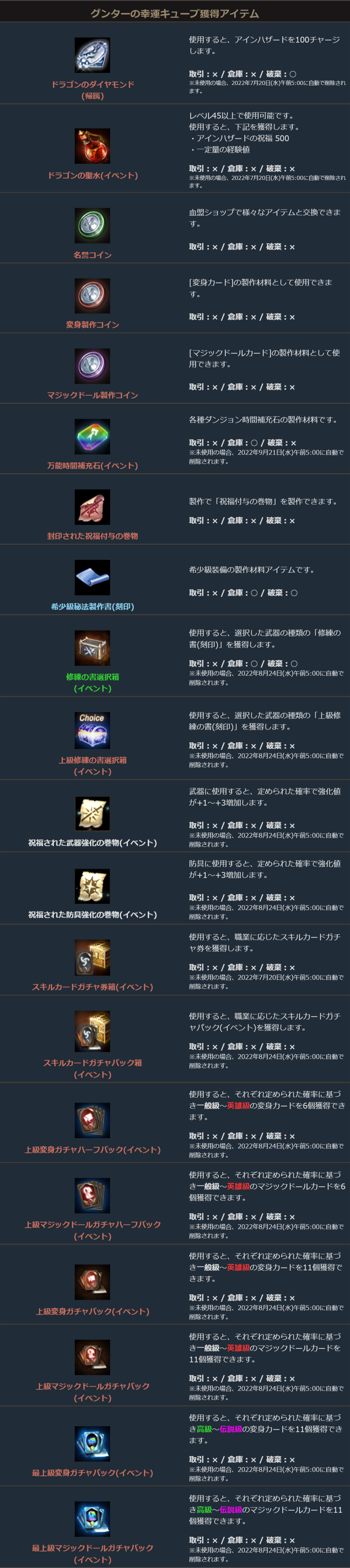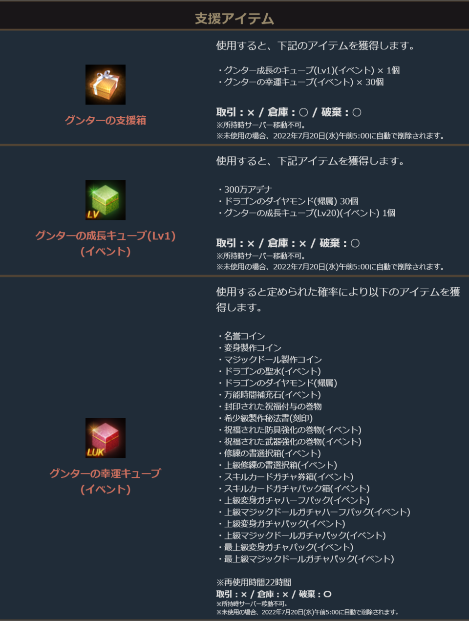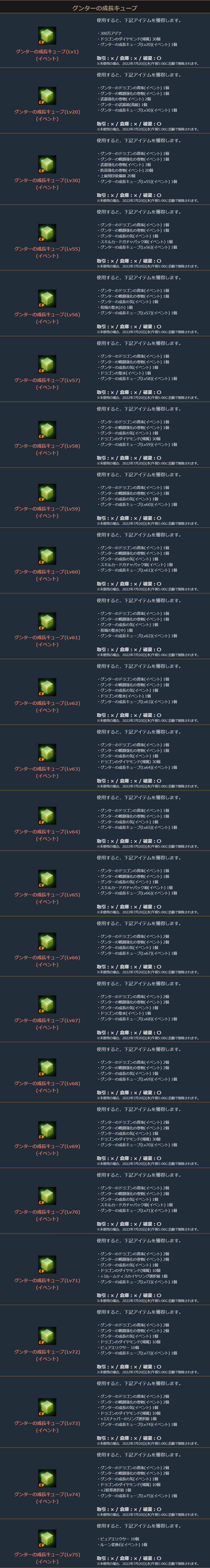 「グンターの支援箱」から手に入る、「グンターの成長キューブ」と「グンターの幸運キューブ」は一定のレベル到達時や一定の時間毎に使用すると、キャラクターの成長に役に立つアイテムが手に入る特別なアイテムです。