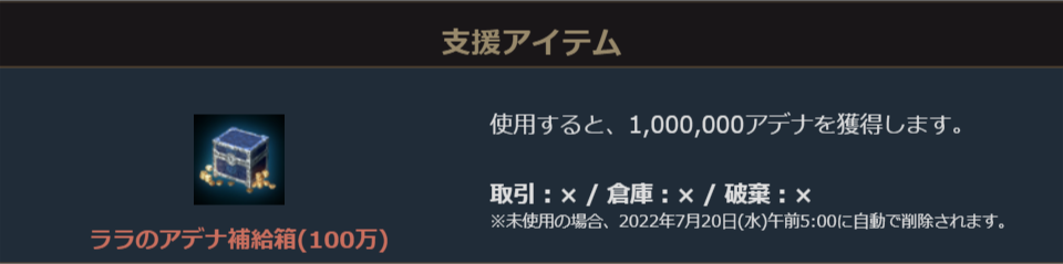 期間中の、「金曜日」「土曜日」「日曜日」の18時に郵便にて「ララのアデナ補給箱(100万)」をお届け致しますので、週末の血盟員との冒険やキャラクターの育成にご活用ください。