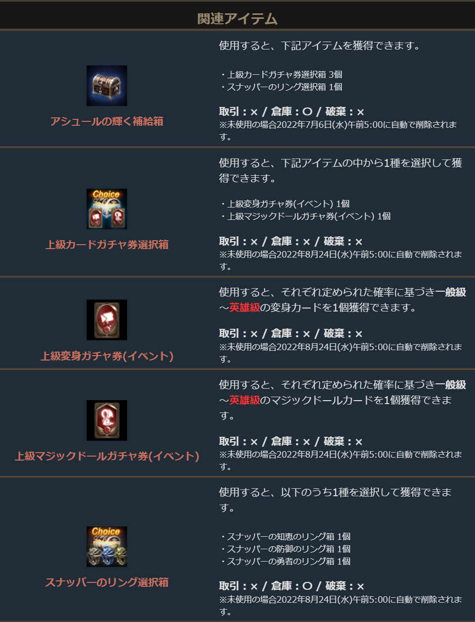※一部アイテムは未使用の場合、一定期間が経過すると自動で削除されます。詳しくは各アイテムの詳細をご確認ください。