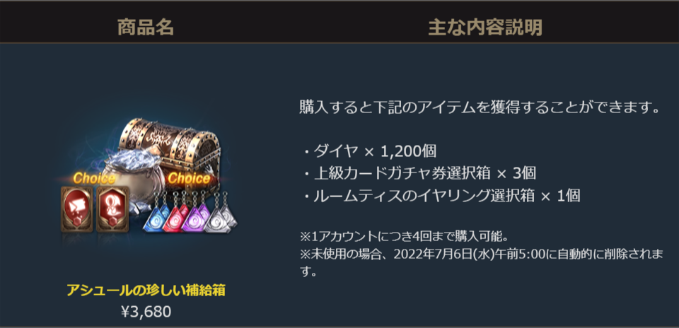 ダイヤと上級ガチャ券、ルームティスのイヤリングがセットになったお得なパッケージです。