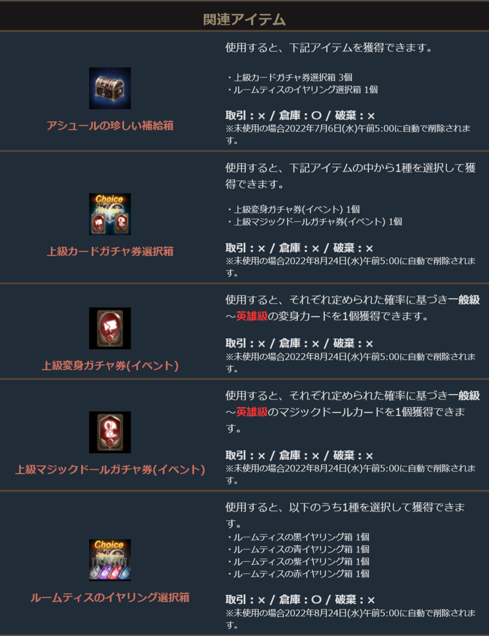 ※一部アイテムは未使用の場合、一定期間が経過すると自動で削除されます。詳しくは各アイテムの詳細をご確認ください。