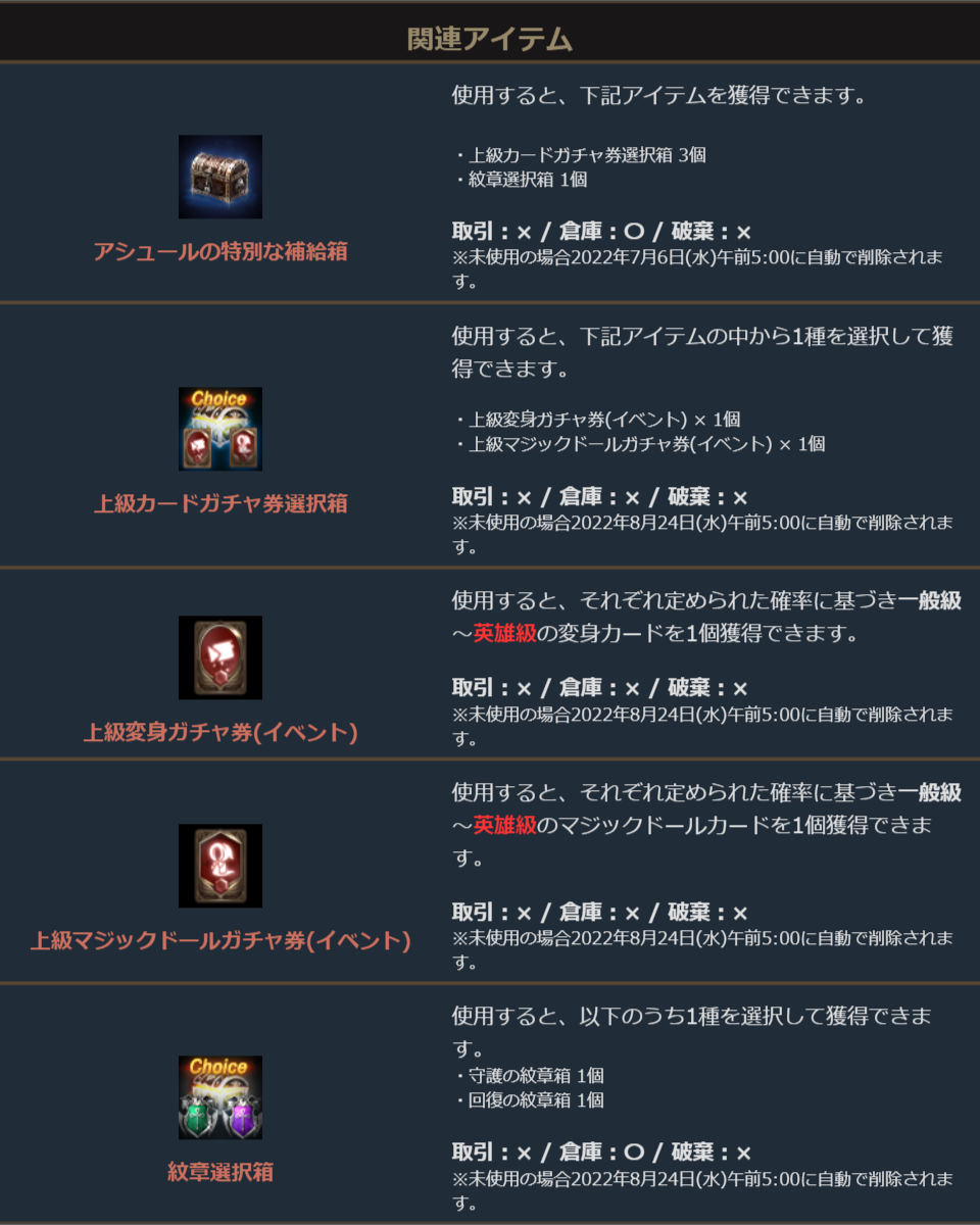 ※一部アイテムは未使用の場合、一定期間が経過すると自動で削除されます。詳しくは各アイテムの詳細をご確認ください。