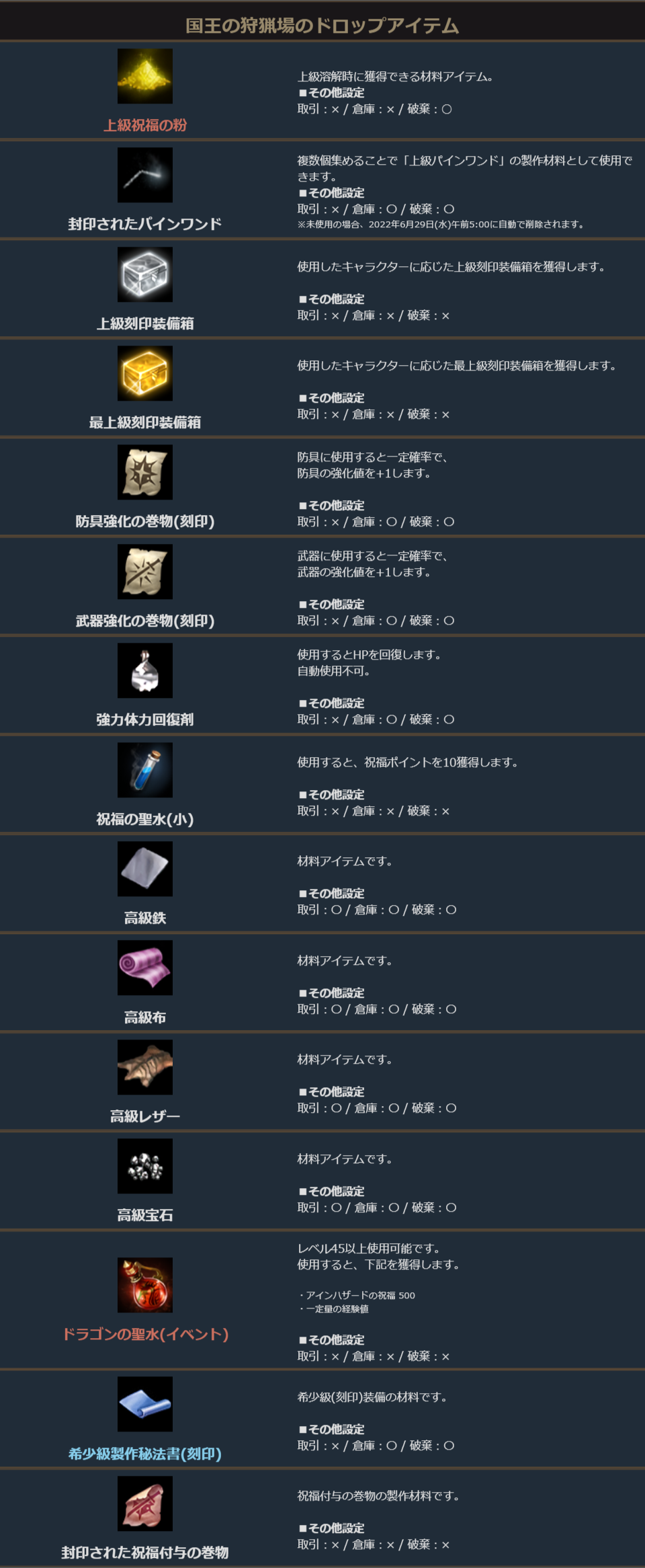 イベント期間中、国王の狩猟場におけるモンスターのドロップは下記となります。