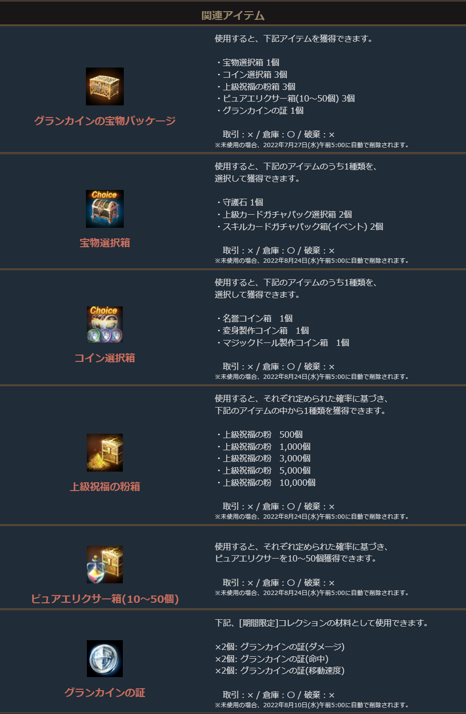 ※一部アイテムは未使用の場合、一定期間が経過すると自動で削除されます。詳しくは各アイテムの詳細をご確認ください。