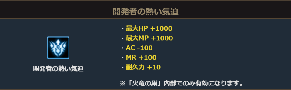 イベントダンジョン「火竜の巣」内部では、アデンの勇士を応援してくれるNPC「カッコよくて優しいイケメン開発者」より支援魔法「開発者の熱い気迫」を貰う事ができます。