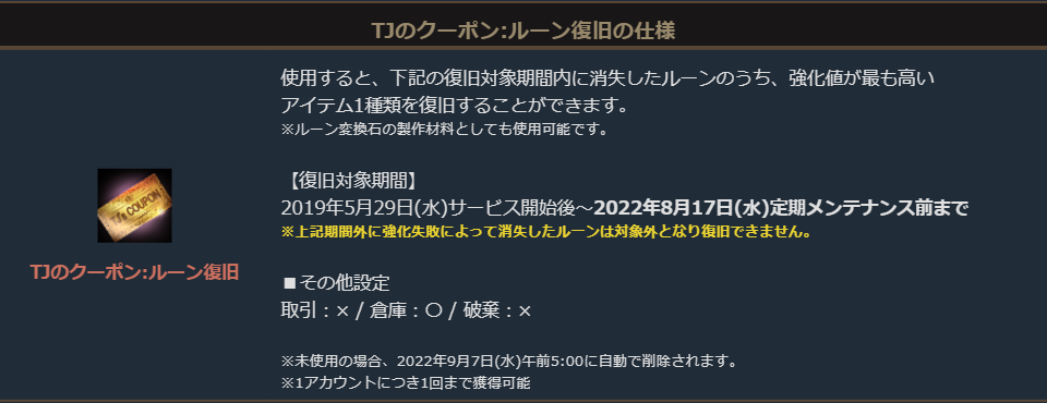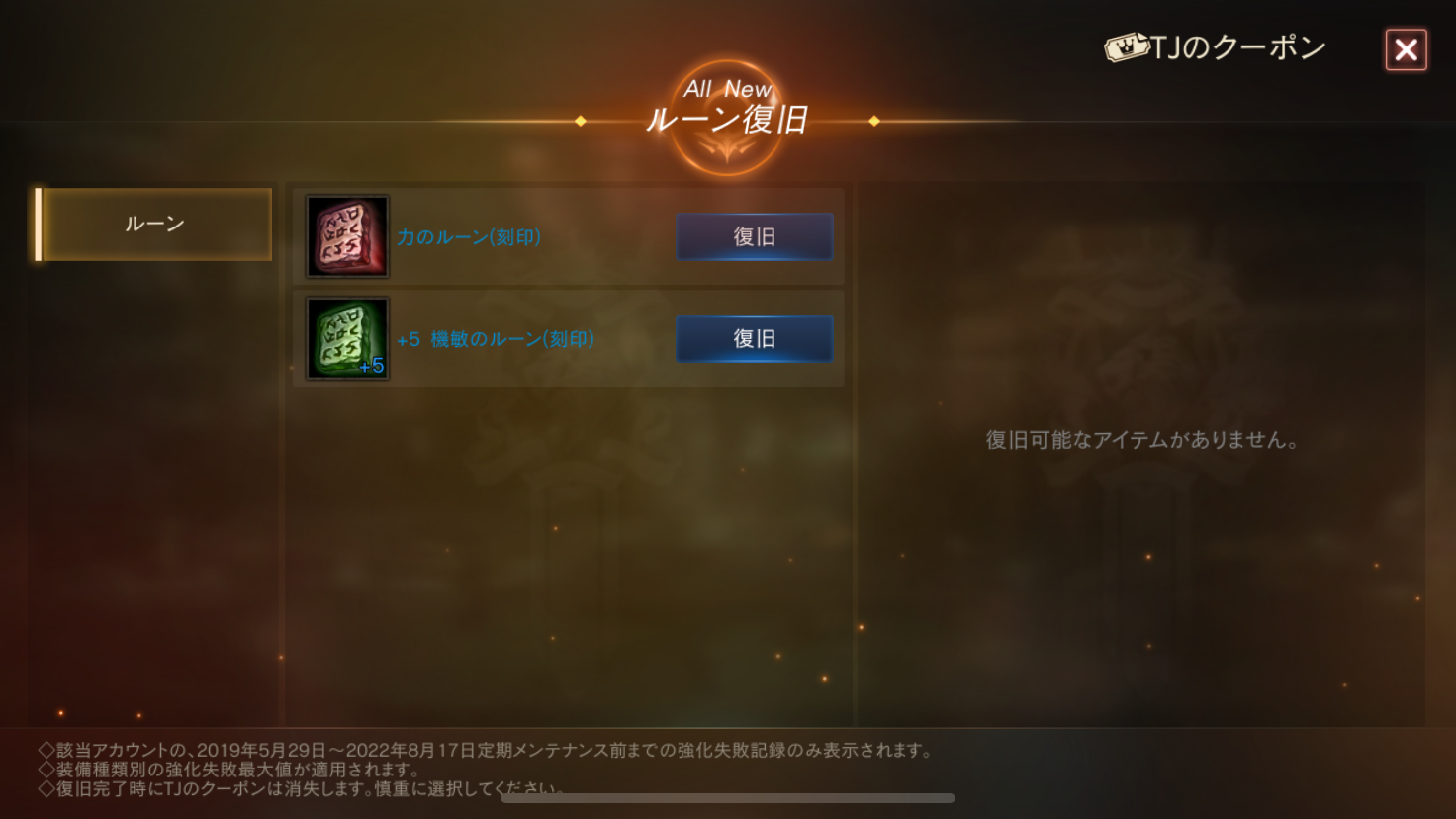 ・「TJのクーポン:ルーン復旧」を使用したキャラクターが過去に行った強化によって消失したルーンのうち、強化値が最も高いアイテム1種類を復旧することができます。