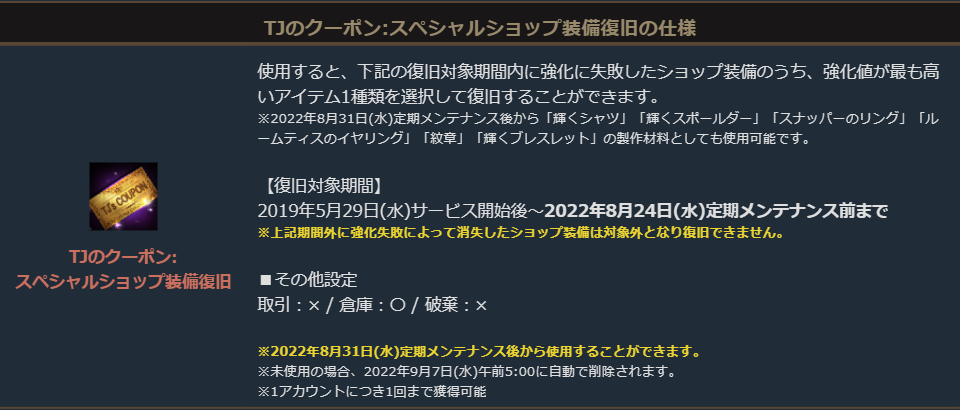 ・「TJのクーポン:スペシャルショップ装備復旧」を使用したキャラクターが過去に行った強化によって消失したショップ装備のうち、強化値が最も高いアイテム1種類を復旧することができます。