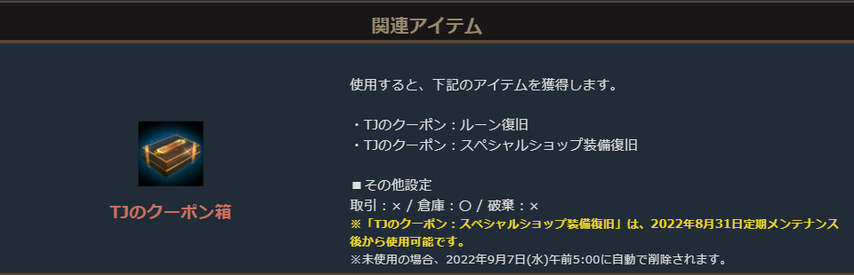 TJのクーポン箱からは「TJのクーポン:ルーン復旧について」と「TJのクーポン:スペシャルショップ装備復旧」を獲得できます