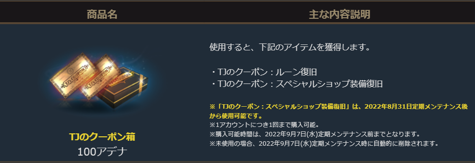 期間中、ショップの「イベント強化」画面よりTJのクーポン箱を100アデナで入手できます。