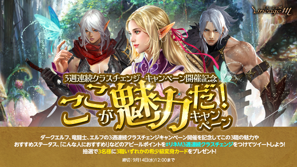 2. ダークエルフ、竜闘士、エルフのいずれかのアピールポイントをハッシュタグ「#リネM3週連続クラスチェンジ」をつけてツイート