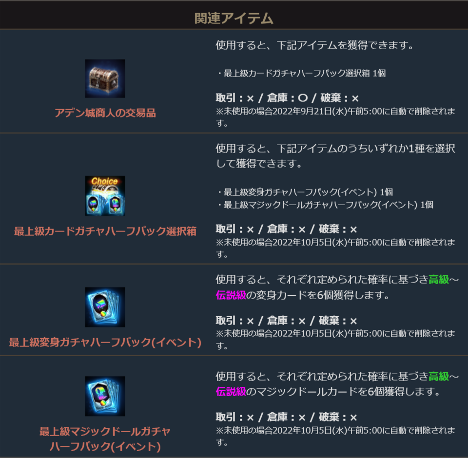 ※一部アイテムは未使用の場合、一定期間が経過すると自動で削除されます。詳しくは各アイテムの詳細をご確認ください。